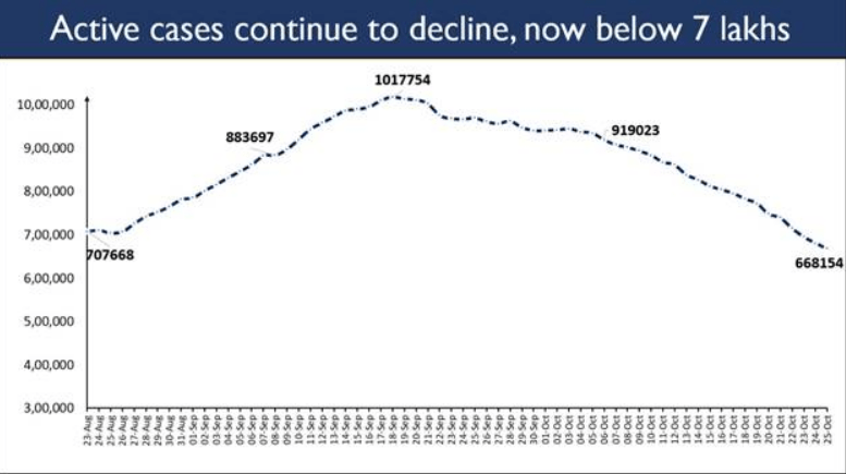This achievement is matched by the downward spiral fall of the total active cases, which are maintained below the 7 lakh mark for the third successive day.