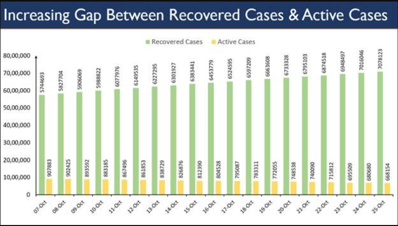 The total recovered cases also continue to rise. They are 70,78,123 so far. With increasing number of recoveries, this gap is continuously widening. The gap between Recovered cases and Active cases has crossed 64 lakh (64,09,969).