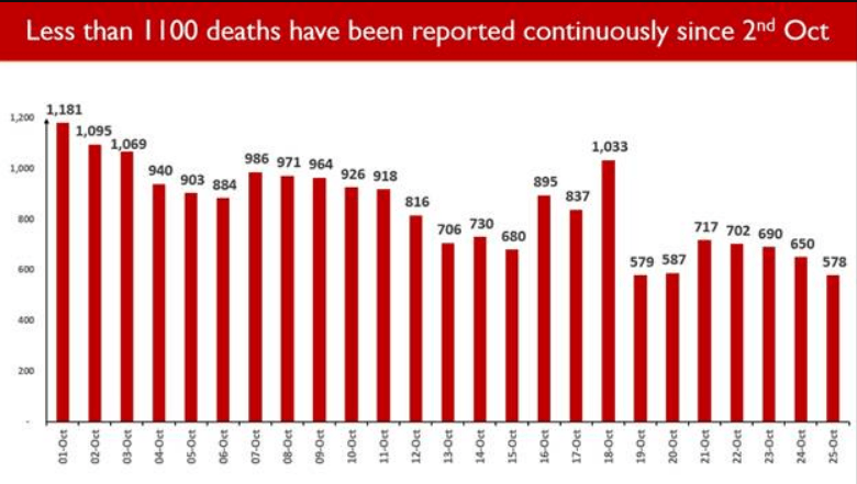 Less than 1000 deaths have been continuously reported since the last one week. The deaths are below the 1100 mark since 2nd October.