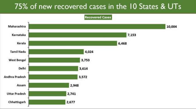 75% of the new recovered cases are observed to be concentrated in 10 States/UTs viz. Maharashtra, Karnataka, Kerala, Tamil Nadu, West Bengal, Delhi, Andhra Pradesh, Assam, Uttar Pradesh, and Chhattisgarh.