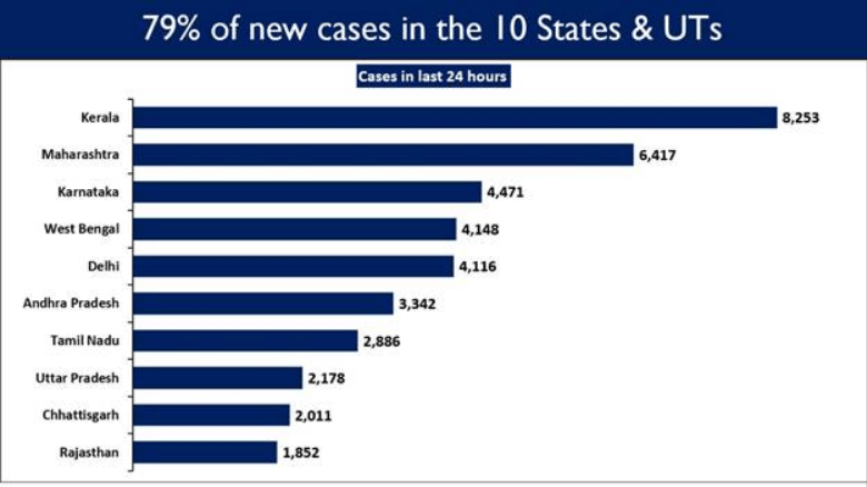 79% of the new cases are from 10 States and UTs. Kerala continues to be the State reporting a very high number of new cases with more than 8,000 cases followed by Maharashtra with more than 6,000 cases.