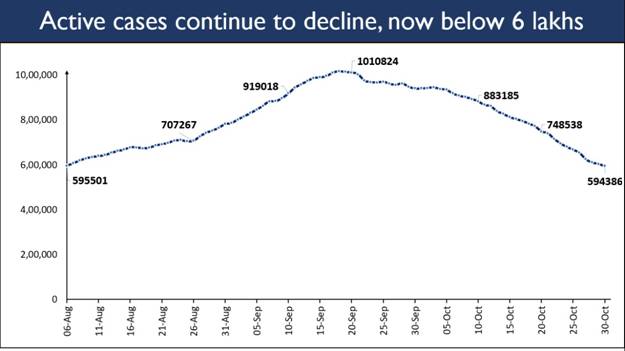 Presently the active cases comprise only 7.35% of the total positive cases of the country standing at 5,94,386. This has strengthened its trend of steady decline.