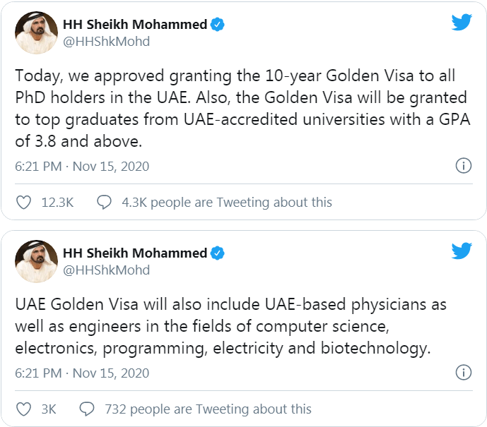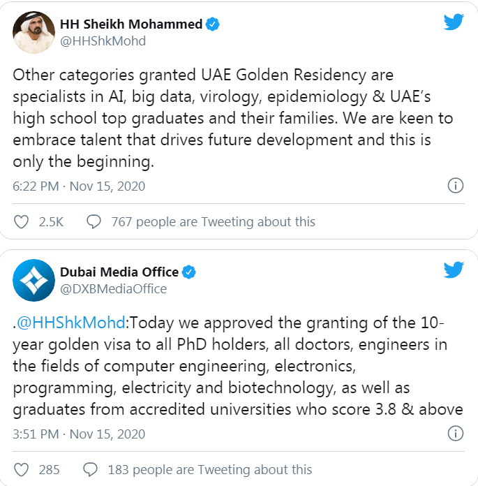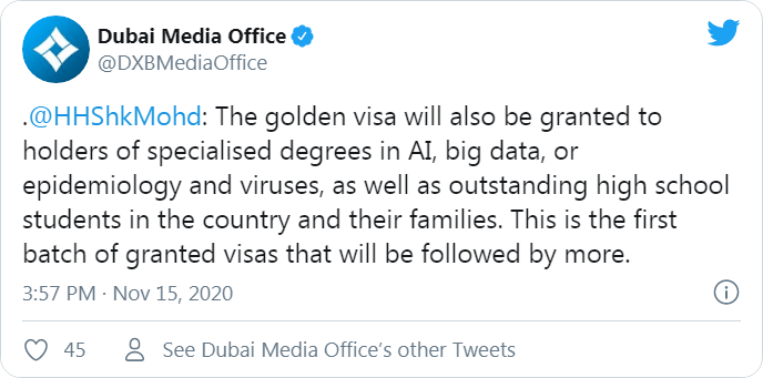 “The golden Visas will also be provided to people who hold degrees specialised in Artificial Intelligence, big data and Viral epidemiology,” Sheikh Mohammed tweeted.