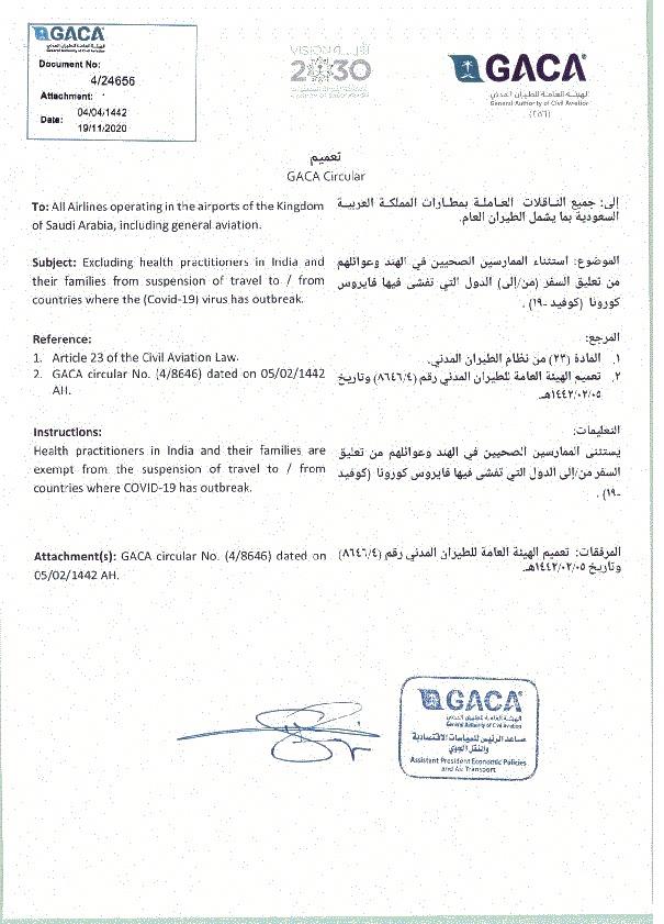 A new circular issued by GACA on Thursday states that “All Airlines operating in the airports of the Kingdom of Saudi Arabia, including general aviation” to excluding health practitioners in India with their families from the suspension of travel To/From countries where the Covid-19 virus has an outbreak.