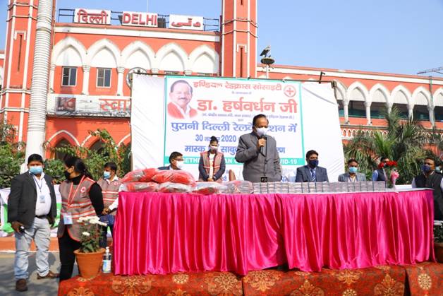 Dr Harsh Vardhan, Union Minister for Health and Family Welfare, Chairman of Indian Red Cross Society (IRCS) distributed masks and soaps at the Old Delhi Railway Station today.