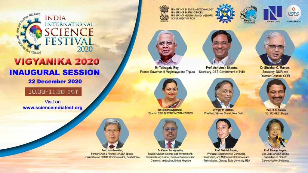 CSIR-National Institute of Science Communication and Information Resources (CSIR-NISCAIR), Ministry of Earth Sciences (MOES) and Vijnana Bharati (VIBHA) jointly organised the inaugural session of Vigyanika-International Science Literature Festival on the opening day of IISF 2020 on the virtual platform to mark the birth anniversary of Srinivasa Ramanujan. Addressing the participants and invitees, Dr Ranjana Aggarwal, Director, CSIR-NISCAIR & CSIR-NISTADS stated that the event is aimed to take science and literature to the masses and showcase strategies to employ various aspects of science communication to promote self-reliance and global welfare.
