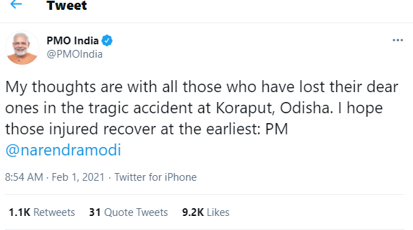 “My thoughts are with all those who have lost their dear ones in the tragic accident at Koraput, Odisha. I hope those injured recovers at the earliest,” the Office of the Prime Minister tweeted.
