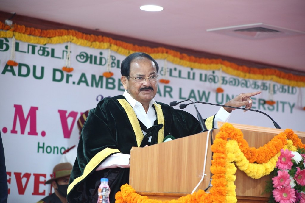Speaking at the 11th Convocation to the Tamil Nadu Dr. Ambedkar Law University, the Vice President urged the graduates to strive hard to excel in their profession, while also making the judicial system accessible, affordable, and understandable for every citizen. Calling for a change in the colonial mindset, the Vice President also wanted the educational institutions and courts to adopt indigenous dresses during convocations and court proceedings.