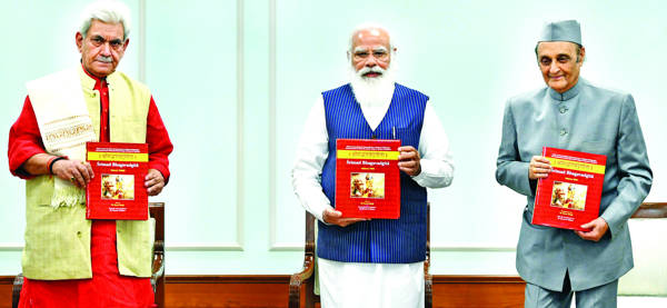 The Prime Minister, Shri Narendra Modi released a Manuscript with commentaries by 21 scholars on shlokas of Srimad Bhagavadgita. Jammu & Kashmir Lt. Governor Shri Manoj Sinha was also present on the occasion along with Dr Karan Singh, the Chairman Trustee of Dharmarth Trust, J&K..