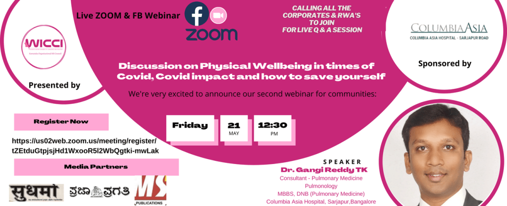 WICCI Karnataka Organisational HR Council organising webinar for communities on Physical Wellbeing in times of Covid, Covid impact and how to save yourself today. The speaker is Dr Gangi Reddi TK.