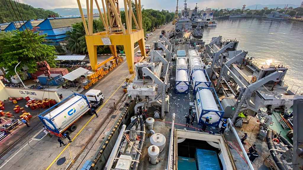 Synopsis: Indian Naval Ship Airavat arrived at the Port of Jakarta, Indonesia on 24 Jul 2021, carrying essential COVID-19 relief supplies. The ship has brought five Cryogenic containers containing 100 MT of Liquid Oxygen and 300 Concentraters to support Indonesia in its fight against the ongoing pandemic.