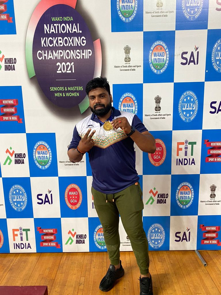 Sudhir Saxena from Varanasi, who has represented India in the International Kick Boxing Competition, under the aegis of Kickboxing Association of Goa, in the ongoing National Kickboxing Championship at Multipurpose Indoor Stadium, Dayanand Bandodkar Krida Sankul, Pedem, Mapusa Goa from 26 to 29 August 2021. Won the gold medal by defeating Shivam Singh of Maharashtra.