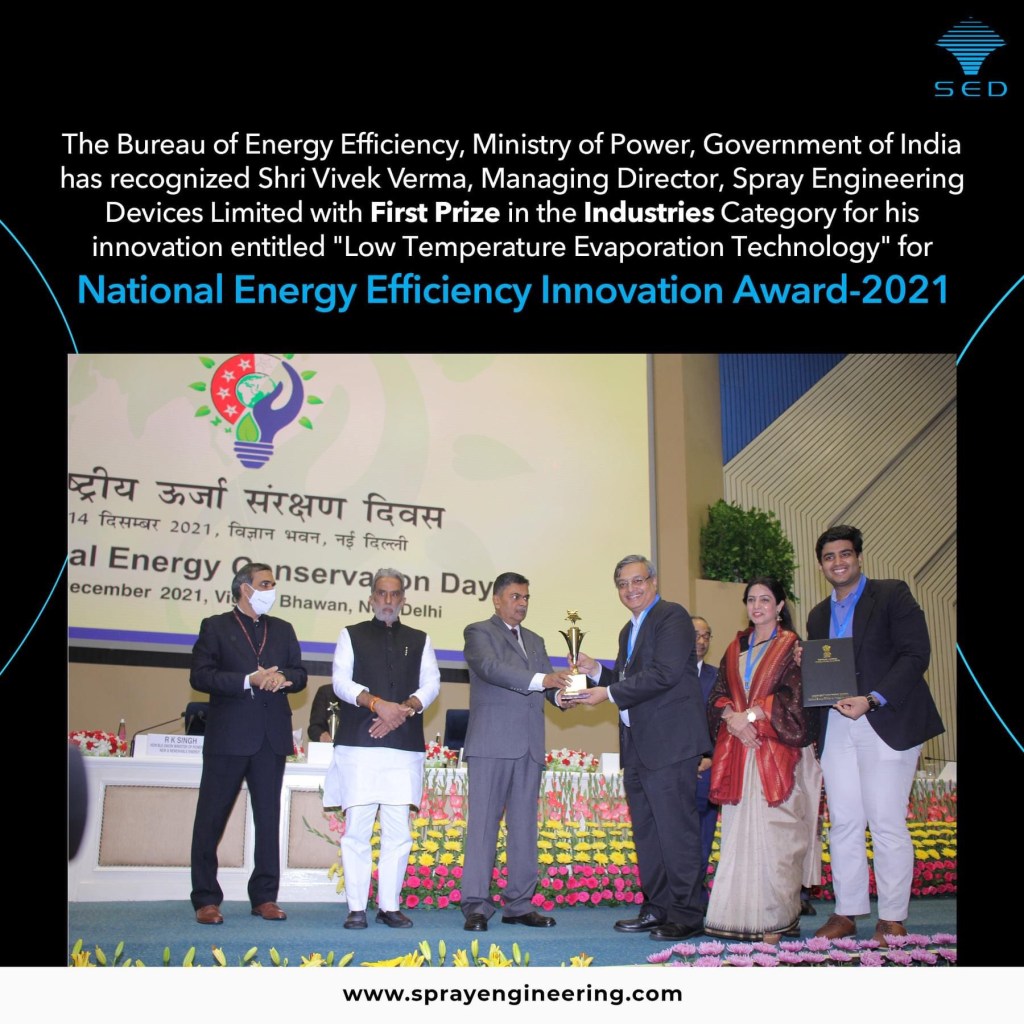 The Bureau of Energy Efficiency, Ministry of Power, Government of India has recognized Shri Vivek Verma, Managing Director, Spray Engineering Devices Limited with FIRST PRIZE in the Industries Category for his innovation entitled “Low-Temperature Evaporation Technology” for National Energy Efficiency Innovation Award-2021.