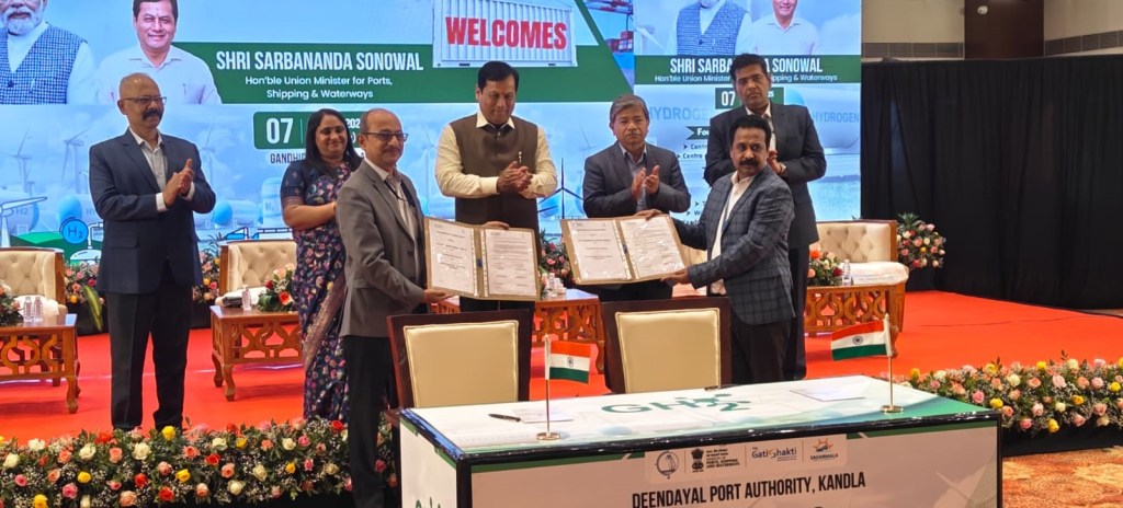 This MoU intends furthering the green energy technologies in Kandla Port under DPA and especially green hydrogen mobility project. For this, a MoU was exchanged among Shri Anuj Singh, GM, NTPC RE and Shri. R Reddy, CME, DPA in the august presence of Hon’ble Union Minister for Ports, Shipping and Waterways Shri Sarbananda Sonowal, Hon’ble MLA Ms. Maltiben Maheshwari and senior officials from NTPC and DPA.