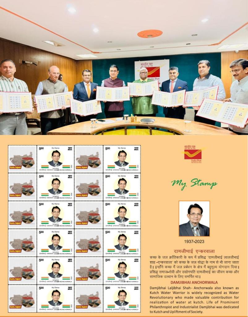 Department of Posts released a customized my stamp on Damjibhai Anchorwala, known as the Kutch Water Warrior. The stamp was released by Chief Postmaster General, Gujarat Circle Shri Ganesh V. Sawaleshwarkar and Postmaster General, North Gujarat Region Shri Krishna Kumar Yadav on 29th December 2025 at a function held at the Circle Office, Ahmedabad. Director of Postal Services, Shri Surekh Reghunathan, Managing Trustee of Saurashtra Trust Shri Hardik Mamania, Trustee Shri Sanjaybhai D. Shah and Shri Atul D. Shah, Editor of Kutchmitra Shri Deepak Mankad, and General Manager of Kutchmitra Shri Mukesh Dholakia have also graced the function.