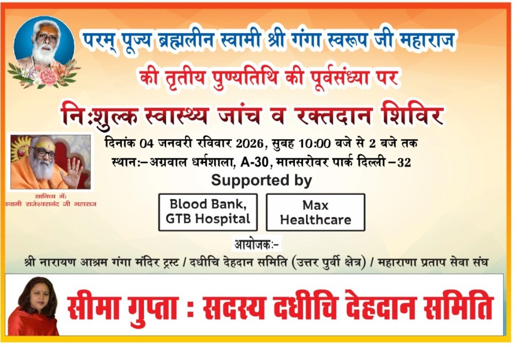 The camp is scheduled for January 4, 2026 (Sunday) from 10 am to 2 pm at Aggarwal Dharamshala, A-30, Mansarovar Park, Delhi-32. It is being supported by the Blood Bank of GTB Hospital and Max Healthcare, ensuring professional medical assistance and safe blood collection.
