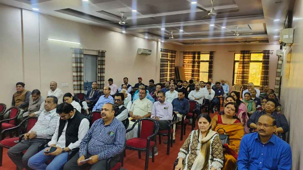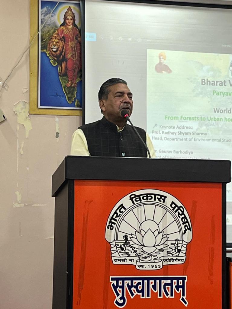 The keynote speaker, Prof. Radheshyam Sharma, Head of the Department of Environmental Studies at Delhi University, delivered an inspiring lecture. He emphasized that small efforts at both individual and community levels can significantly contribute to sustainable development. Stressing the principle “Nature is First and Human is Second,” he said that lasting development is impossible without maintaining harmony with nature. He also encouraged youth to explore ecological entrepreneurship by combining traditional knowledge with innovation.