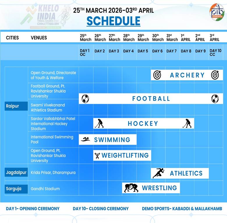 The Khelo India Tribal Games 2026 is being conducted over a ten-day period, with events scheduled across multiple venues to ensure smooth and efficient conduct of competitions. The schedule has been designed to accommodate parallel events across disciplines, allowing athletes adequate time for participation and progression.