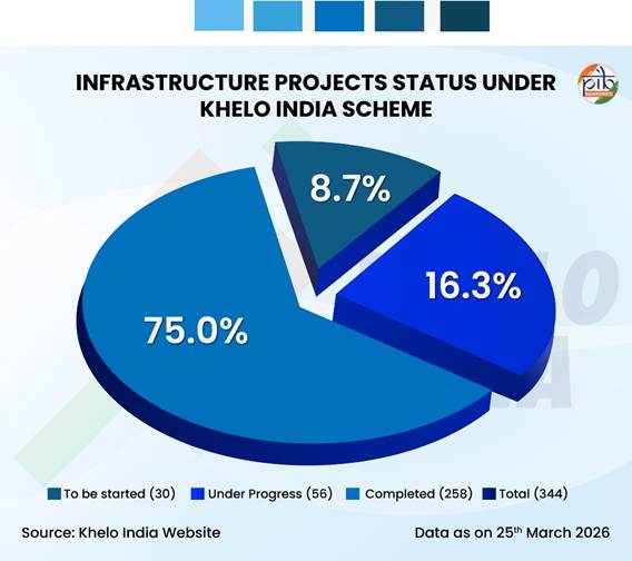 Across the country, covering all States and Union Territories, the Khelo India programme has significantly expanded sports infrastructure, with a total of 344 projects sanctioned so far. These projects represent an overall financial commitment of ₹3,158.15 crore sanctioned, with ₹2,730.95 crore already released, reflecting steady progress in implementation.